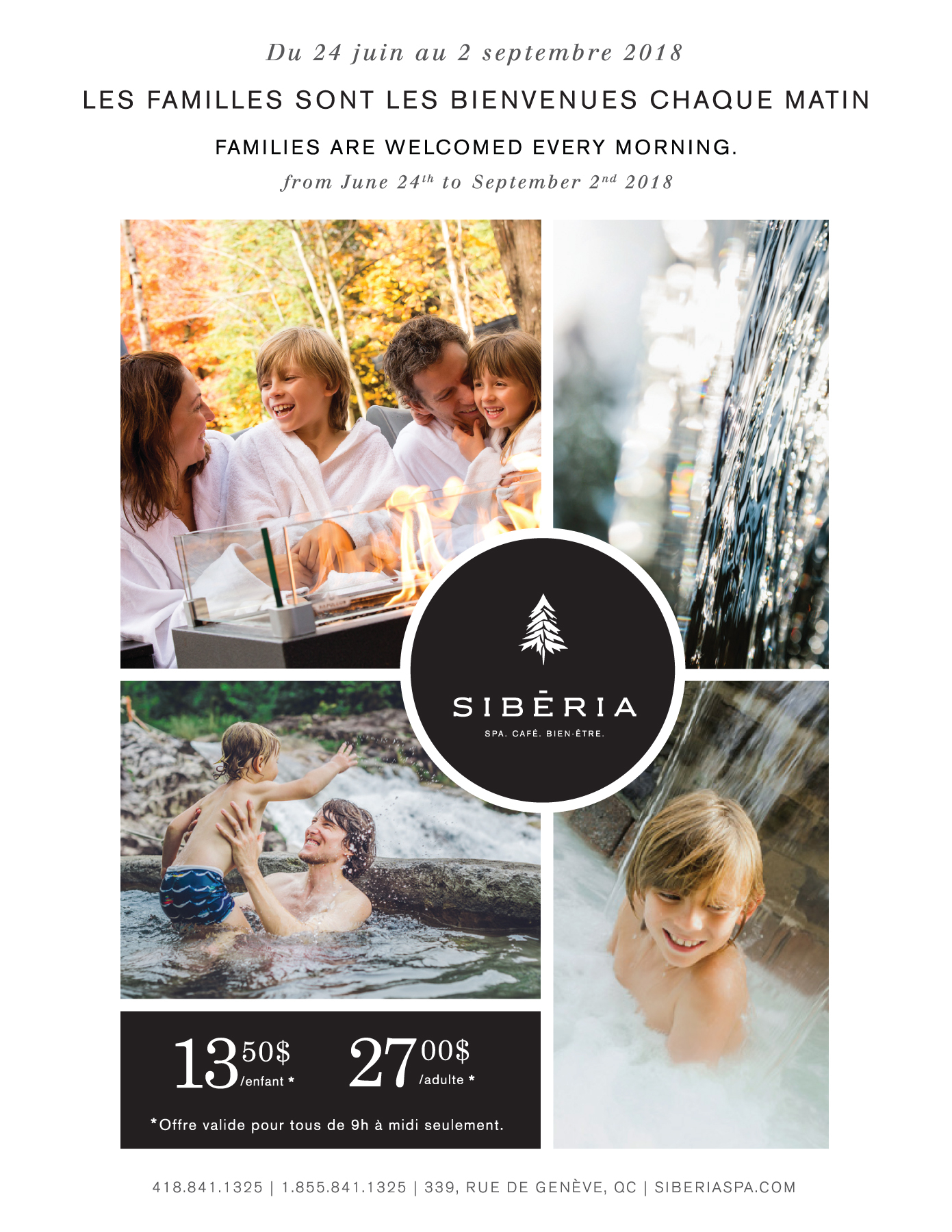 Nous ouvrons pour les familles à tous les dimanches matin et lors de périodes spéciales durant l’année telles que la période des fêtes, vacances estivales et semaine de relâche. Vous aurez ainsi accès à toutes nos installations extérieures. Vous pouvez également réserver un massage pour votre enfant, d’une durée de 30 ou 60 minutes. Nous vous offrons aussi la possibilité de recevoir votre massage dans la même salle que votre enfant (nous possédons 5 salles tandem), qui l’appréciera sûrement, surtout s’il s’agit d’une première expérience.